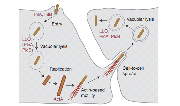 L. monocytogenes is an intracellular bacterial pathogen, thus immunity to infections caused by the organism is cell-mediated. The ability of the pathogen to multiply inside the cell gives it ability to evade attack by antibodies, complements and other components of the hostโs immune system. L. monocytogenes produces and utilizes eukaryotic actin, a protein-like molecule that allows the pathogen to evade immune system attack, and thus enable it to move rapidly and freely through the epithelial cells without being detected by the hostโs immune system mechanisms.