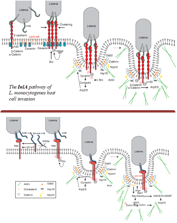 The two bacterial cell wall surface proteins InlA and InlB interact specifically with adhesion molecules or receptors on the epithelial cells of the host (e.g. E-Cadherin) and this interaction promote the invasion and entry of L. monocytogenes into the host cells including cells of the placenta, intestine and the blood-brain-barrier. L. monocytogenes is an intracellular bacterium, and it produces listeriolysin O (a membrane liquefying and pore-forming enzyme) within the phagolysosome where it is enclosed.