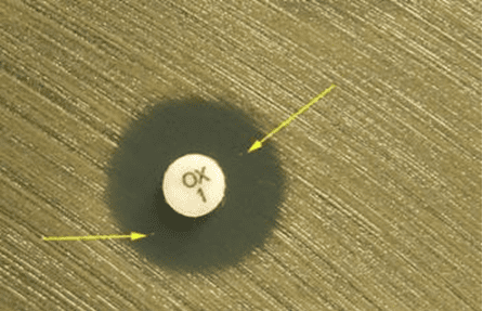 Figure 1 is the surface of a Mueller-Hinton agar plate inoculated with a strain of S. aureus suspected of being methicillin-resistant. Though the zone of inhibition is at the borderline for resistance (18 mm), the presence of small colonies within the zone of inhibition (arrows) indicates the presence of heteroresistant strains of S. aureus. The interpretation here, therefore, is “methicillin-resistant” staphylococci, even though the zone diameter appears to be adequate. The detection of the heteroresistant strains in disk diffusion test indicates that minimum inhibitory concentration (MIC) studies are required to confirm the presence of MRSA strains.