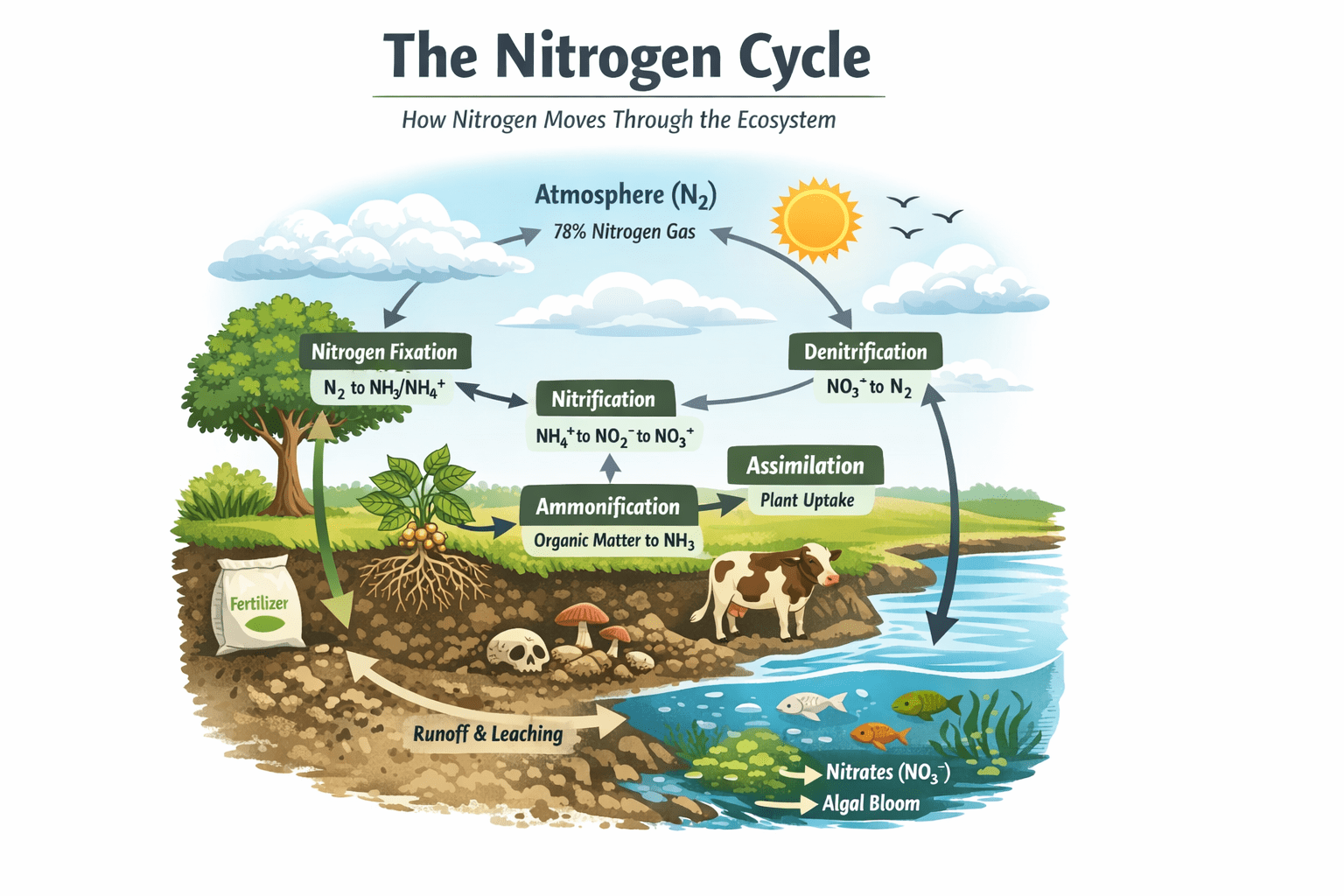 The nitrogen cycle is a critical process that sustains life on Earth by ensuring the continuous transformation and availability of nitrogen in forms usable by plants, animals, and microorganisms. From nitrogen fixation and nitrification to denitrification, ammonification, and assimilation, the cycle integrates terrestrial and aquatic ecosystems, supports biodiversity, and underpins human food production. However, anthropogenic activities have significantly altered this cycle, leading to environmental challenges such as eutrophication, soil degradation, and greenhouse gas emissions. By understanding the processes of the nitrogen cycle and implementing sustainable management strategies, humans can harness nitrogen’s benefits while minimizing its environmental impacts.